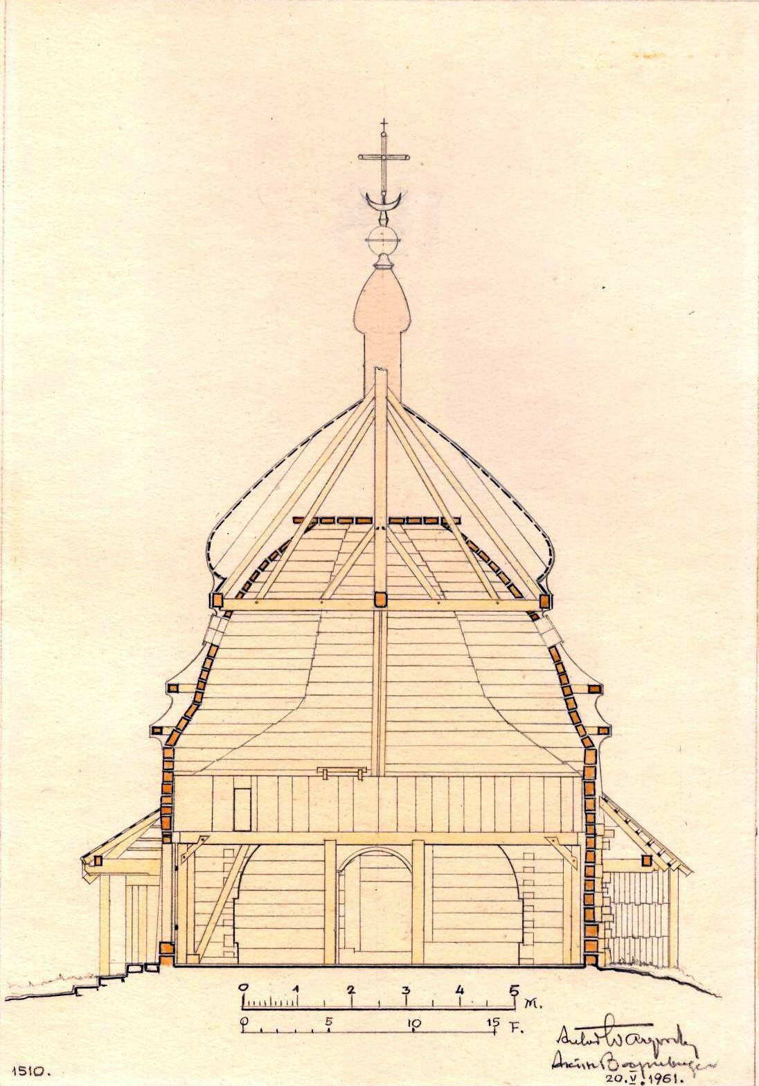 1961 р. Переріз з видом на хориРозмір зображення: 1096:1568 піксел Рисунок Антона Вариводи (Краків), 20.05.1961 р. 1510 Church, Ulyuch (Uljucz), Sanok, Ukraine. Cross section “6-7” through the nave, showing the choir balcony. |