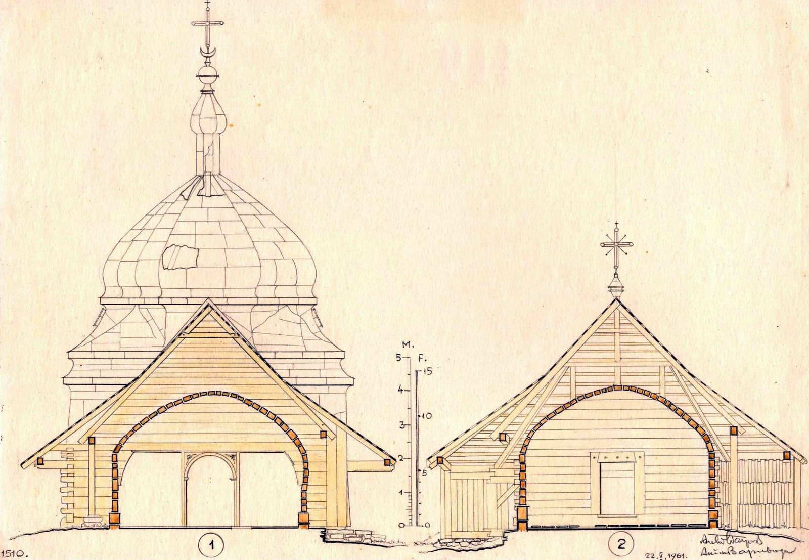 1961 р. Переріз притвораРозмір зображення: 1600:1107 піксел Рисунок Антона Вариводи (Краків), 22.05.1961 р. 1510 Church, Ulyuch (Uljucz), Sanok, Poland. 1 – Cross section “9-10” through the narthex, showing the main entrance door. |