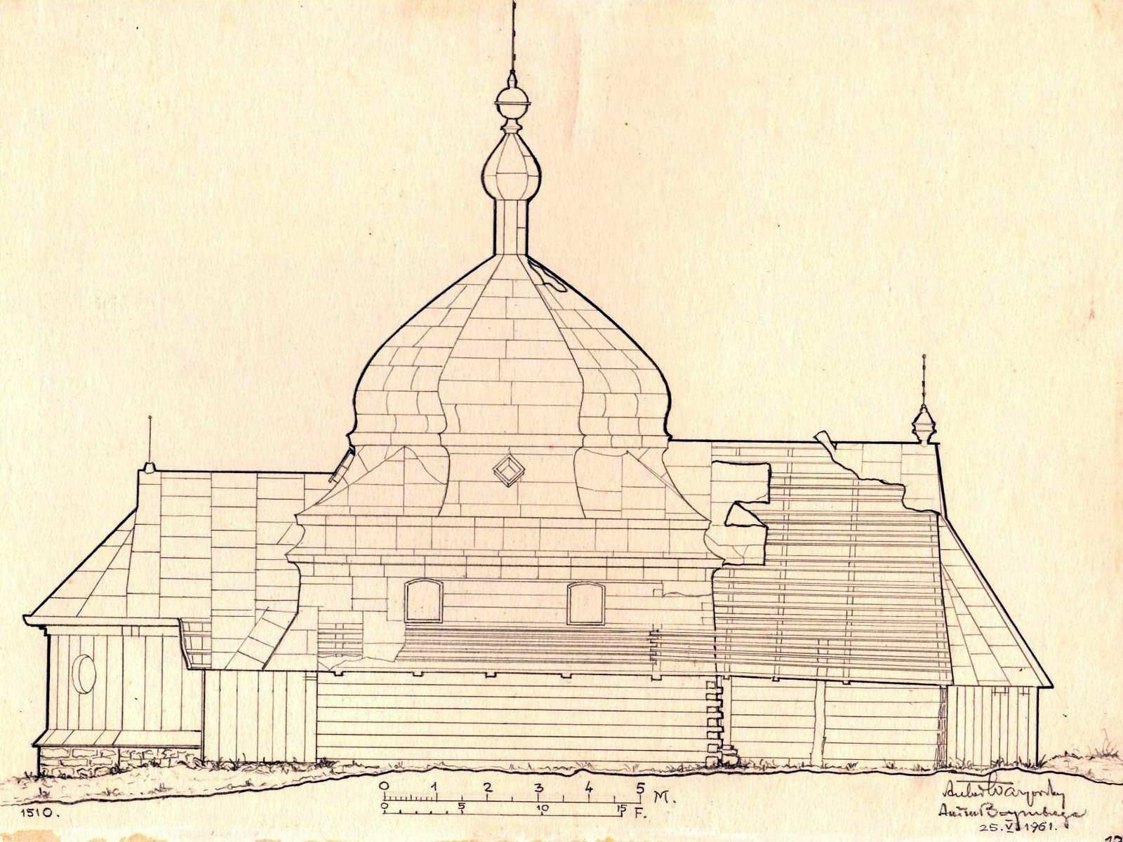 1961 р. Північний фасадРозмір зображення: 1600:1200 піксел Рисунок Антона Вариводи (Краків), 25.06.1961 р. 1510 Church, Ulyuch (Uljucz), Sanok, Ukraine. North elevation, showing a portion of the damaged sheet metal roof. |