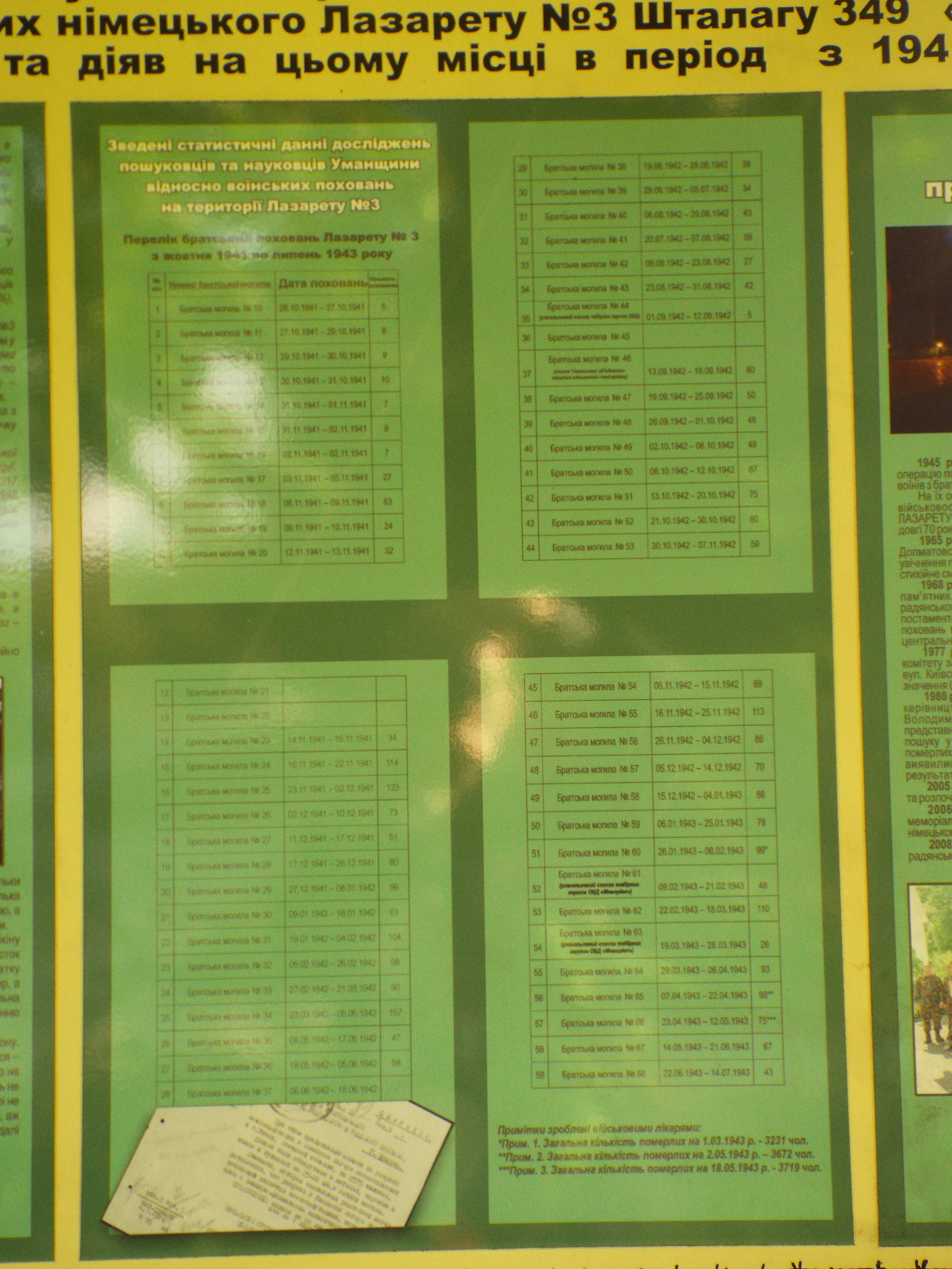 Середня частинаРозмір зображення: 3456:4608 піксел Інформаційний знак на місці кладовища лазарету №3 шталагу 349 «Уманська яма». Фото Івана Парнікози, 3 жовтня 2017 р. |