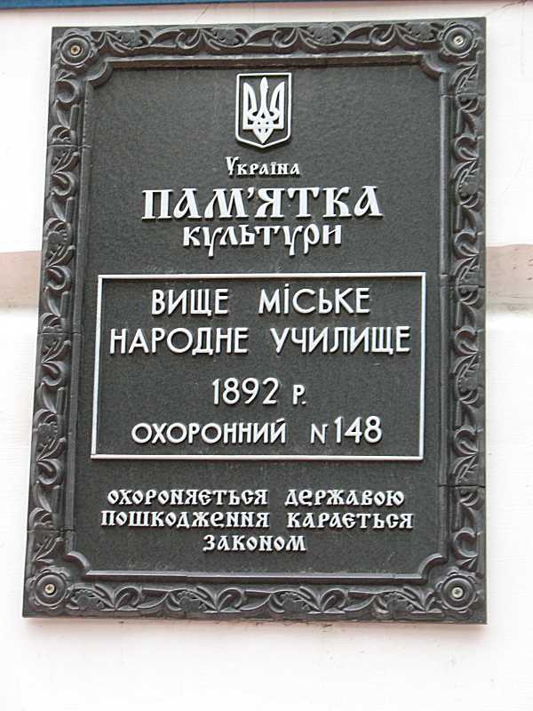 Охоронна дошка пам’яткиРозмір зображення: 600:800 піксел Вище міське народне училище (педагогічне училище), 1892 р. – вул. Небесної Cотні, 33. Фото Івана Парнікози, 14 червня 2011 р. |