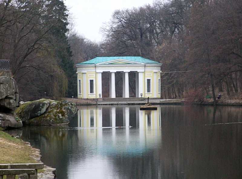 Нижній ставок і фонтан «Змія» на тлі павільйону Флори. Фото М. І. Жарких, 19 березня 2015 р.