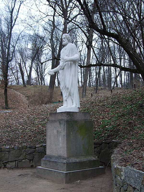 Статуя ЕврипідаРозмір зображення: 600:800 піксел На північно-забідному березі Нижнього ставка. Фото М. І. Жарких, 19 березня 2015 р. |