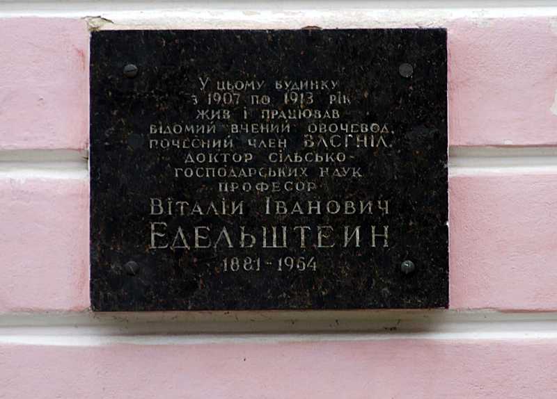 На дошці напис: «У цьому будинку з 1907 по 1913 рік жив і працював відомий вчений-овочевод, почесний член ВАСГНІЛ, доктор сільськогосподарських наук професор Віталій Іванович Едальштейн (1881 – 1964)».