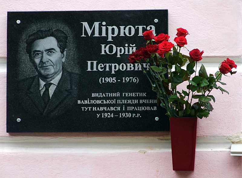 На дошці напис: «Мірюта Юрій Петрович (1905 – 1976) – видатний генетик вавіловської плеяди вчених – тут навчався і працював у 1924 – 1930 рр.».