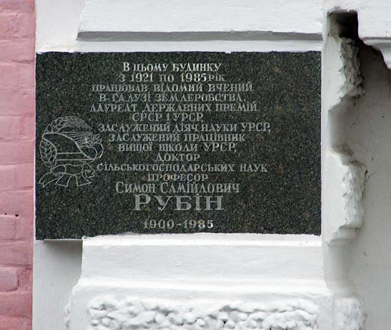 На дошці напис: «В цьому будинку з 1921 по 1985 рік працював відомий вчений в галузі землеробства, лауреат Державних премій СРСР і УРСР, заслужений діяч науки УРСР, заслужений працівник вищої школи УРСР, доктор сільськогосподарських наук, професор Симон Самйлович Рубін (1900 – 1985)».