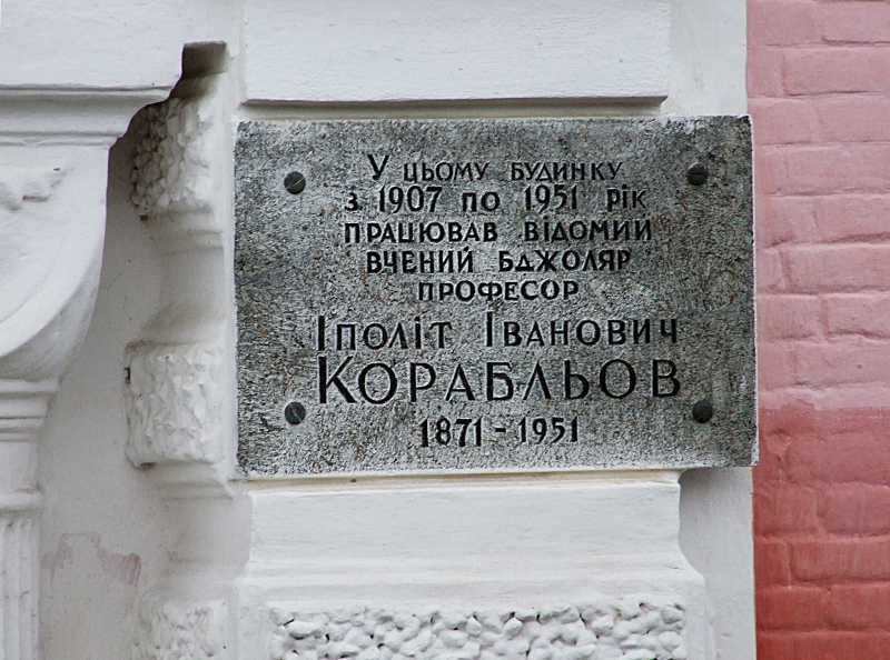 На дошці напис: «У цьому будинку з 1907 по 1951 рік працював відомий вчений-бджоляр, професор Іполіт Іванович Корабльов (1871 – 1951)».