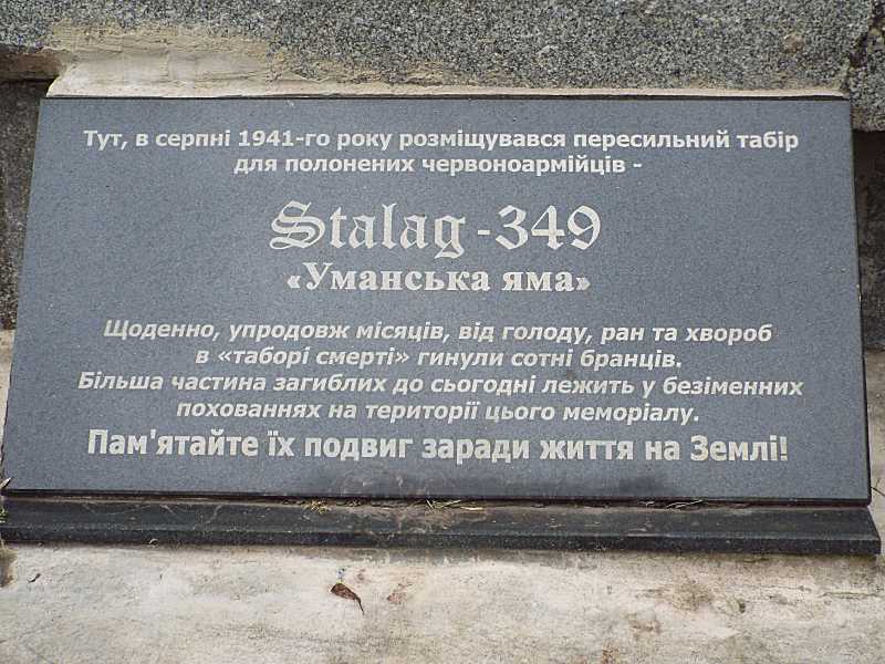 Табличка з написомРозмір зображення: 800:600 піксел Уманська яма. Цегельня – місце німецького Сталагу 349. Монумент. Фото Івана Парнікози, 4 жовтня 2017 р. |