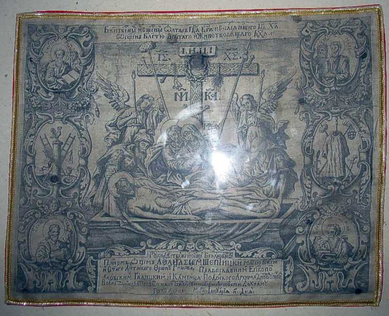 Антимінс Афанасія ШептицькогоРозмір зображення: 800:649 піксел Фото Зенона Боровця і Богдана Тхора, 6 жовтня 2006 р. Назва храма не проставлена (антимінс-бо друкований), дата внизу: року АΨК[?] меляца януарія И [8] дня. |
