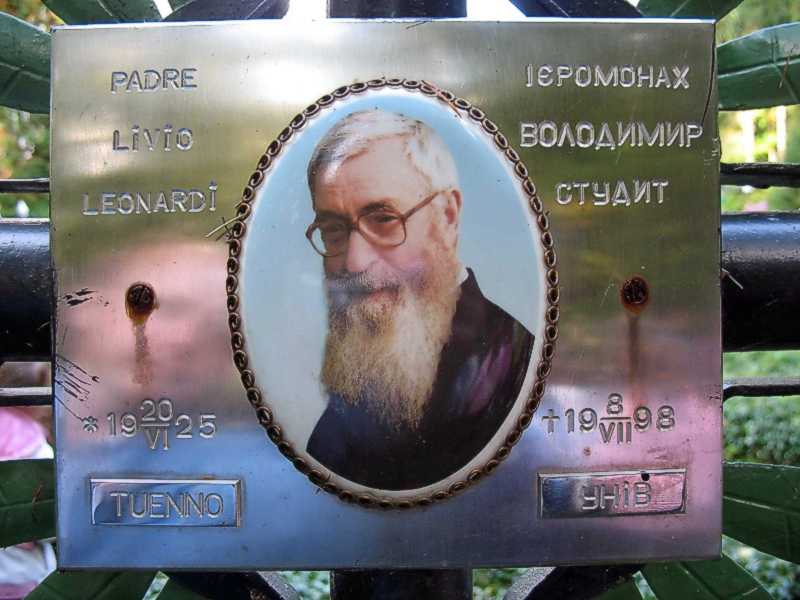 Напис: «Padre Livio Leonardi – ієромонах Володимир студит 20.06. 1925 Tuenino – 8.07.1998 Унів».
