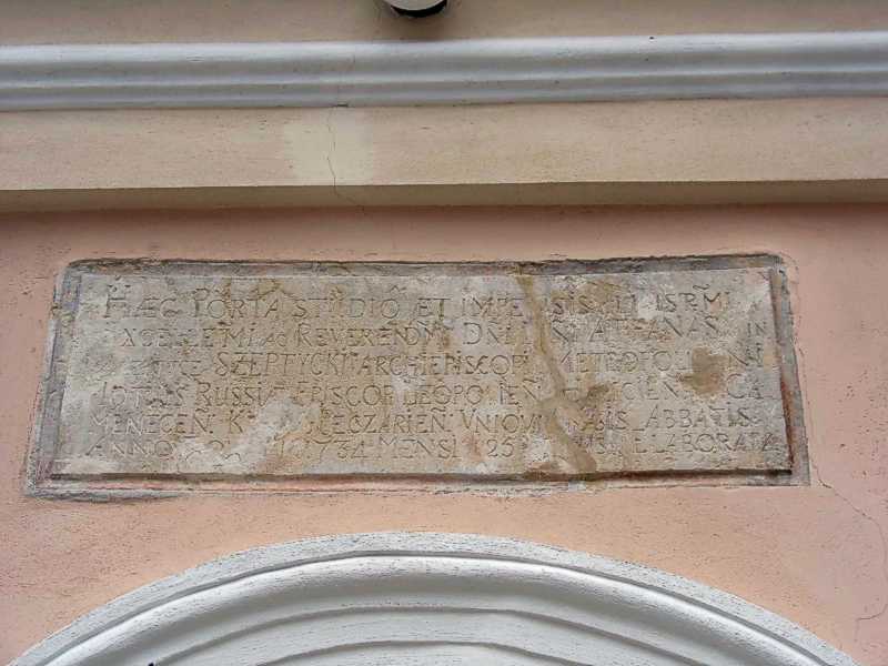 2006 р. Напис над входомРозмір зображення: 800:600 піксел Фото Зенона Боровця і Богдана Тхора, 8 жовтня 2006 р. Напис латинською мовою, можна розібрати «Шептицький архієпископ… 1734 р. дня 25…» |