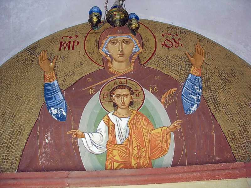 Стінопис «Богородиця знамення»Розмір зображення: 800:600 піксел Тло імітує мозаїку, ле техніка, як і всього образу – малярська, не мозаїчна. Фото Зенона Боровця і Богдана Тхора, 22 липня 2008 р. |