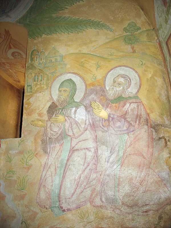 Стінопис «Ченці на молитві»Розмір зображення: 600:800 піксел Частина якоїсь більшої композиії. Фото Зенона Боровця і Богдана Тхора, 24 липня 2008 р. |
