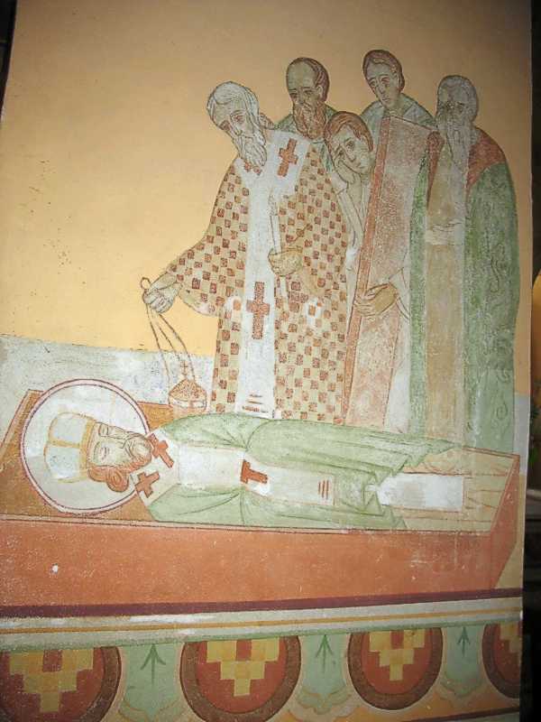 Стінопис «Поховання єпископа»Розмір зображення: 600:800 піксел Фото Зенона Боровця і Богдана Тхора, 28 липня 2008 р. |