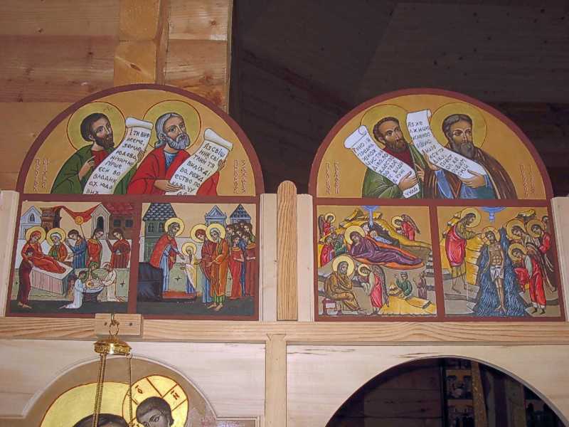 Пророчий і празниковий ряди (ліва частина)Розмір зображення: 800:600 піксел Фото Зенона Боровця і Богдана Тхора, 29 травня 2010 р. Пророчий ряд: Міхей, Захарія, Гедеон, Ісайя. Празниковий ряд: Різдво богородиці; Введення; Різдво Христове; Хрещення. |