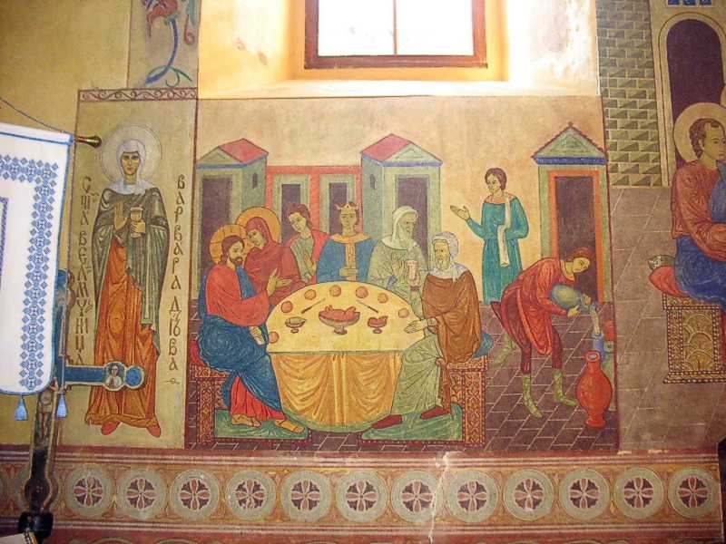 Стінопис «Шлюб у Кані» (?)Розмір зображення: 800:600 піксел Фото Зенона Боровця і Богдана Тхора, 20 квітня 2015 р. Ліворуч – св. Варвара. |