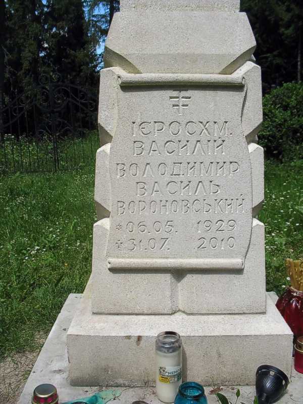 Постамент із написомРозмір зображення: 600:800 піксел Фото Зенона Боровця і Богдана Тхора, 2 червня 2015 р. Напис: «Ієросхм. Василій Володимир Василь Вороновський 6.05.1929 – 31.07.2020». |