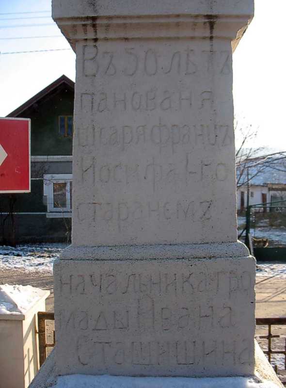 Напис: «В 50 лет панованя цісаря Франца Йосифа 1-го старанєм начальника громады Ивана Сташишина».
