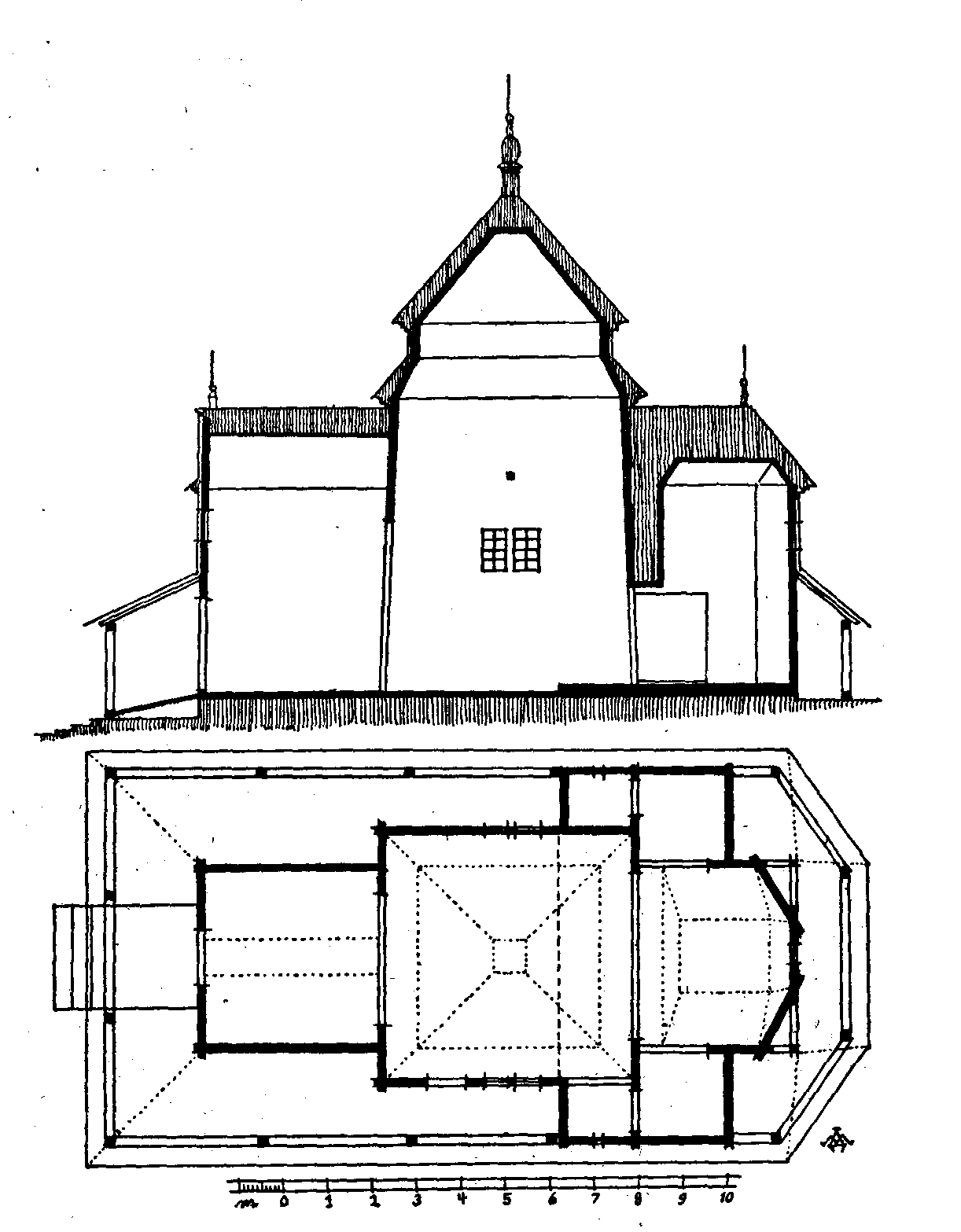 Поздовжній переріз і планРозмір зображення: 1222:1567 піксел Церква 17 ст. (дерев.). Бабинець і північний крилос реконструйовано. Джерело: Драган М. Українські деревляні церкви. – Льв.: 1937 р., т. 2, с. 64. |
