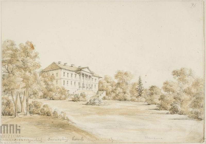Pałac. Widok od strony ogrodu. Pałac dwukondygnacjowy, wysoko podpiwniczony, z portykiem kolumnowym w wielkim porządku i schodami zewnętrznymi. 1862 – 1876. Napis: z Porczyńskich Omiecińskiej Korneli teraz przedana Czechom; Urwenna; napis na podkładzie: Urwenna, – paląc. Wołyń. Rys. ołówkiem podmalowany sepią, 20,4x29,4. Ill-r.a. 4282 (Teka Wołyń). [Katalog rysunków architektonicznych ze zbiorów Muzeum narodowego w Krakowie. 1. Rysunki Napoleona Ordy / Opracowały Zofia Kucielska i Zofia Tobiaszowa. – Warszawa: Państwowe wydawnictwo naukowe, 1975, Nr. 772]