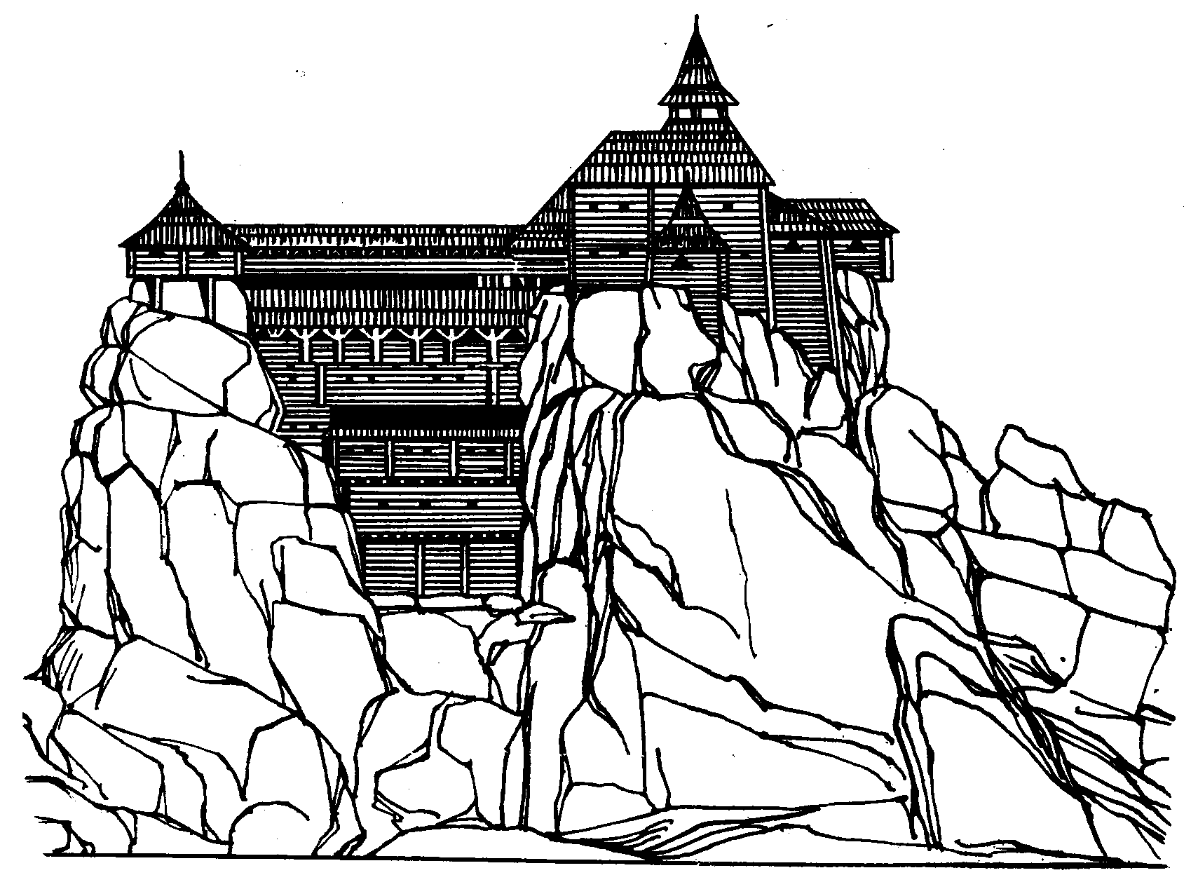 Фортеця Тустань. Х – ХІІІ ст.Розмір зображення: 1709:1258 піксел Фортеця Тустань. Х – ХІІІ ст. Реконструкція М. Ф. Рожка. Джерело: Народна архітектура українських Карпат. – К.: Наукова думка, 1987 р., с. 183. |