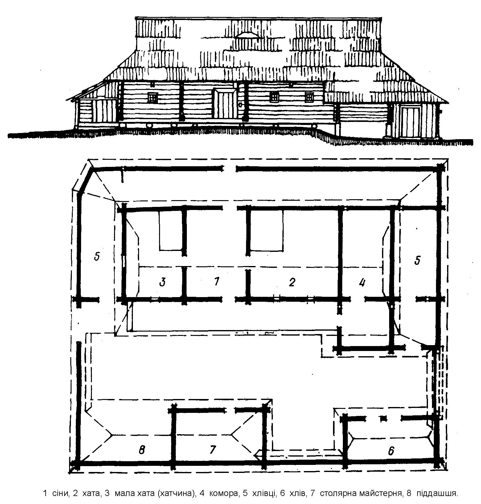 1 – сіни, 2 – хата, 3 – мала хата (хатчина), 4 – комора, 5 – хлівці, 6 – хлів, 7 – столярна майстерня, 8 – піддашшя.