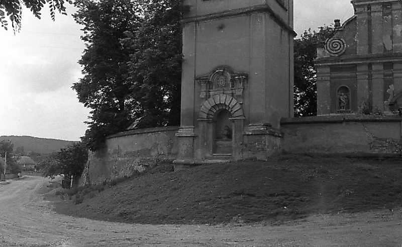 1988 р. Огорожа і 1-й ярус двіниці. Вигляд зі сходуРозмір зображення: 800:491 піксел 1988 р. 14 червня. Фото М.І.Жарких. Негатека, № 392-01. |
