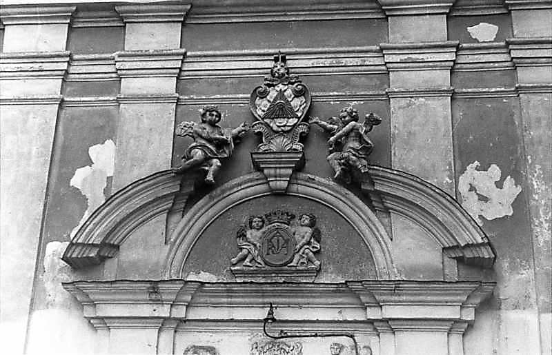 Фрнтон порталу Розмір зображення: 800:515 піксел 1988 р. 14 червня. Фото М.І.Жарких. Негатека, № 392-22. Вкладені елементи Центральна частина (+) Ангели тримають картуш з монограмою RAVIA (+)