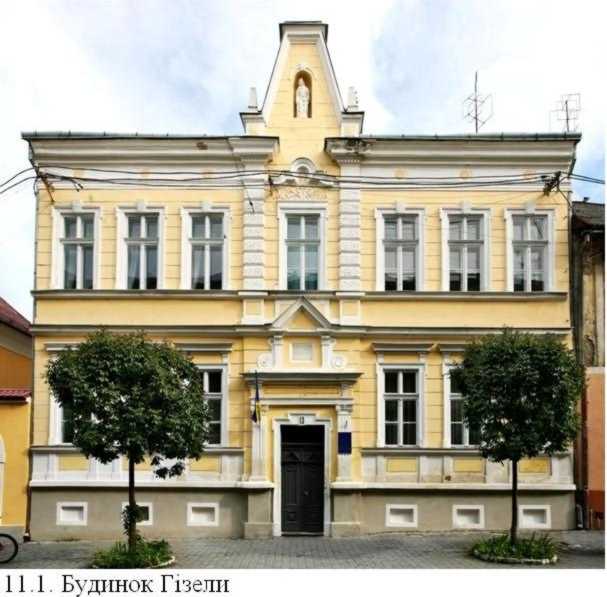 «Будинок Гізели», 1903, 1907 (іст., архіт.). Вул. А. Волошина, 13. Hині Ужгородське державне музичне училище ім. Д. Задора. Розміщений на червоній лінії забудови вулиці з невеликим схилом у центральній частині старого міста.