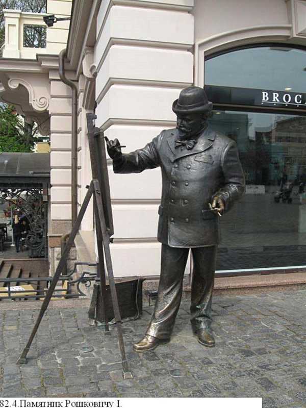 Пам’ятник Рошковичу І., 2012 (мист.) На перетині площі Театральної та набережної Незалежності, яка за часів Австро-Угорщини носила ім’я художника Ігнація Рошковиця. Встановлено 19 листопада на пошанування відомого художника за ініціативи депутата Ужгородської міської ради Івана Волошина. Автор: скульпт. Михайло Колодко.