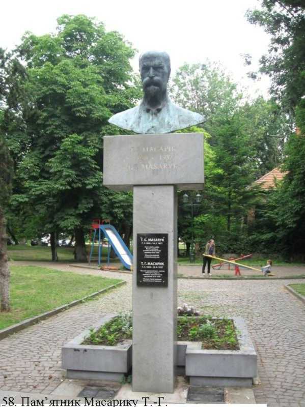 Пам’ятник Масарику Т.-Г., 2002 (мист.). Наб. Незалежності. У зеленому масиві скверу поблизу транспортного мосту, названий на його честь (1929).