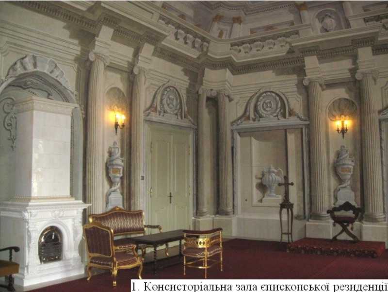 Консисторіальна зала в резиденції єпископаРозмір зображення: 800:601 піксел Джерело: Звід пам’яток історії та культури України. . – К.: 2017 р. |