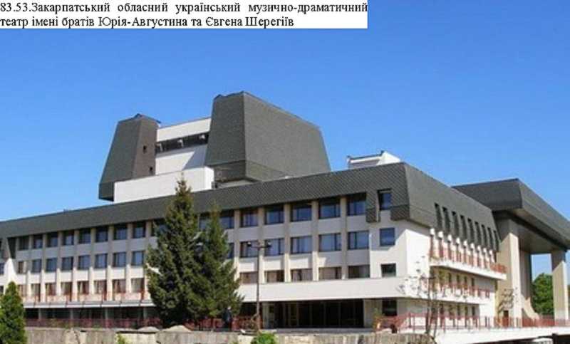 У 1987 Закарпатський обласний український музично-драматичний театр перейшов у нове приміщення на вул. Л.Толстого, 12, із глядацькою залою на 815 місць, сучасним обладнанням, гримувальними, фойє. У 2011, згідно з рішенням Закарпатської обласної ради № 344 від 13.12.2011, театру присвоєно ім’я братів Юрія-Августина та Євгена Шерегіїв. У 2012 на колонах фасаду встановлено бронзові меморіальні дошки з барельєфним зображенням портретів Юрія-Августина і Євгена та театральних масок. Автор: скульпт. Б. Корж.