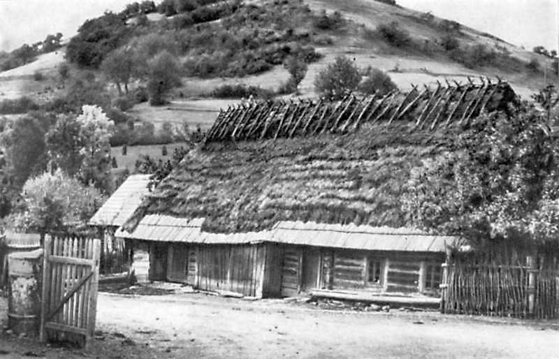 [1976 р.] Хата. Загальний виглядРозмір зображення: 800:514 піксел Хата в селе Ужок Великоберезнянского района Джерело: Макушенко П. И. Народная деревянная архитектура Закарпатья (18 – начала 20 века). – Москва: Стройиздат, 1976 г., с. 104. |