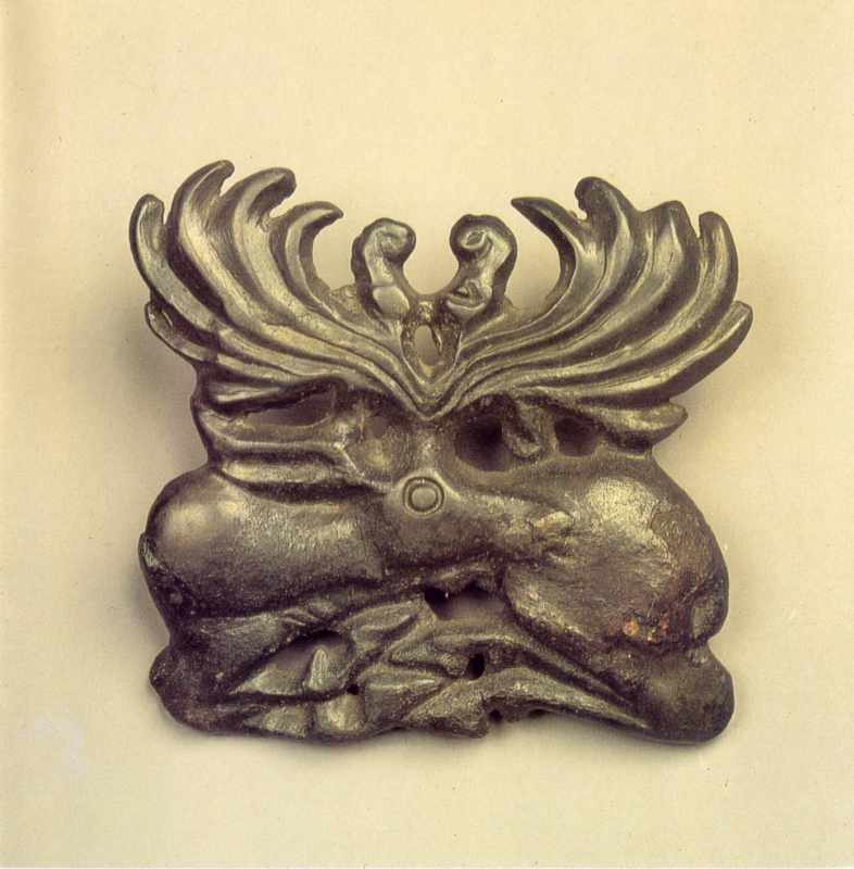 Пластина вуздечки у формі лежачого оленя з головою, оберненою назад, і рогами, розміщеними окремо.