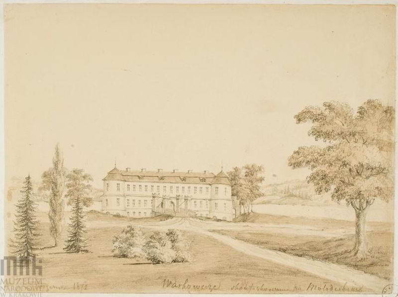 Zamek Młodeckich dawniej Ledóchowskich. Widok od strony wjazdu. Zamek dwukondygnacjowy z wielobocznymi basztami na narożach; przed zamkiem most zwodzony. 1872. Dat.: 12 Września 1872. Napis: Warkowieże skonfiskowane po Mołodeskim; napis na podkładzie: G. Wołyńska Warkowicze, – zamek. Rys. ołówkiem podmalowany sepią, 18,4x24,7. III-r.a. 4284 (Teka Wołyń). Bibl.: Jarosżewski, Rottermund, Wiadomości o życiu i twórczości, il. 29. [Katalog rysunków architektonicznych ze zbiorów Muzeum narodowego w Krakowie. 1. Rysunki Napoleona Ordy / Opracowały Zofia Kucielska i Zofia Tobiaszowa. – Warszawa: Państwowe wydawnictwo naukowe, 1975, Nr. 779]