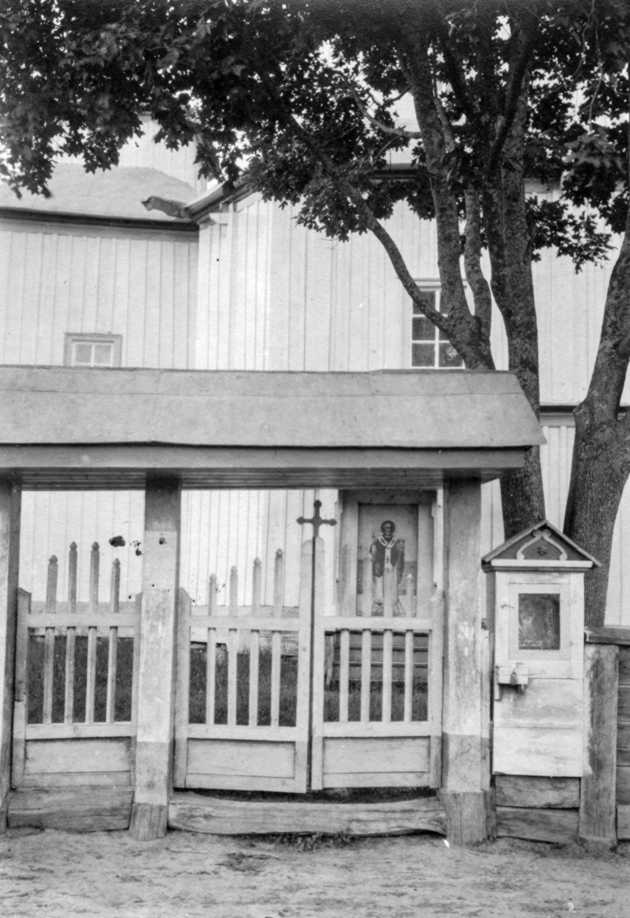 1909 р. Брама на тлі церквиРозмір зображення: 630:918 піксел Фото Бориса Костянтиновича Реріха (1885 – 1945) з експедиції 1909 р. (нині зберігається в Інституті мистецтвознавства, фольклору та етнографії в Києві). Опубліковано 6 листопада 2019 р. |