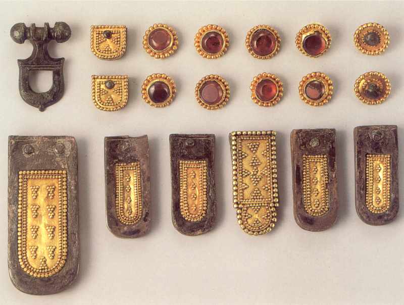 Золото, бронза, гранат. Розміри: (a) 28: 19 мм; (b) 11: 11 мм; (c) 11 мм; (d) 11 мм; (e) 48.5: 21.5 мм; (f) 31: 14 мм; (g) 32.5: 14 мм.