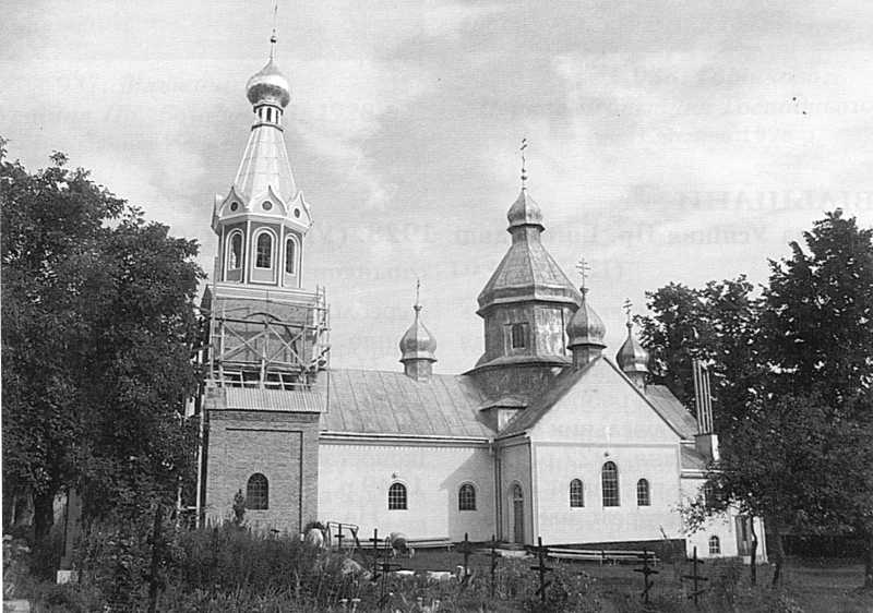 У 1925 р. вже стояв фундамент церкви і незабаром під веденням Василя Гузанича постала хрещата п’ятидільна церква з шатровим верхом посередині. Першим священиком став о. Василь Поп. 18 липня 1931 р. церква згоріла дотла, але ще того ж року люди взялися за спорудження на старому фундаменті цегляної церкви, що повторювала розміри та форми старої. Цеглу випалювали в селі. Дерев’яну одноярусну каркасну дзвіницю поставили вище західного фасаду.
