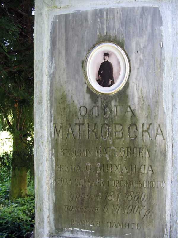 Напис: «Ольга Матковска з дому Матковска жена о. Михаила парохаи декана Горожаньскогоурож. 18.I.1860 померла 6.VII. 1907 р. Вічная память!»