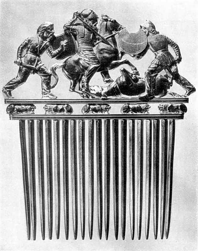 Шедевром боспорської торевтики є золотий гребінь того самого часу з кургана Солоха. На верхній частині його над зубцями зображено п’ятьох лежачих левів. Над ними розміщено скульптурну групу, яка змальовує битву кінного воїна з двома пішими. Сцену виконано динамічно, в ажурній техніці. Добре показано одяг і озброєння воїнів (с. 74).