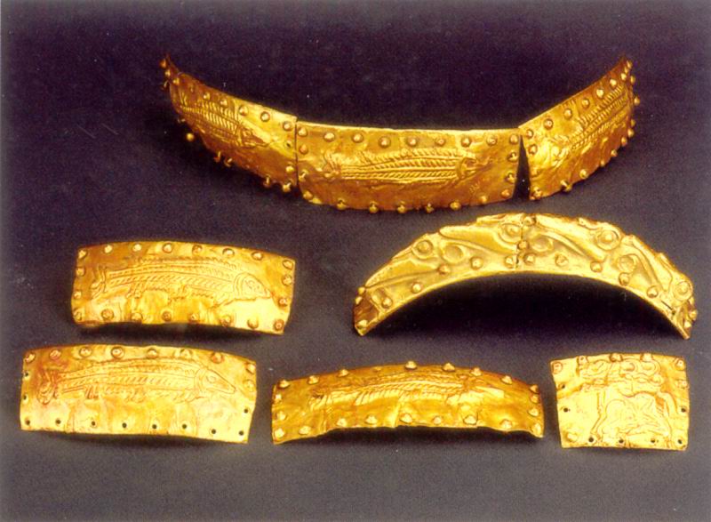 Несохранившийся деревянный сосуд был украшен шестью накладками с изображением рыбы, одной – с оленем, и боковой ручкой, на которой нанесены четыре головы хищных птиц. В памятниках Европейской Скифии деревянные сосуды с золотыми аппликациями по краю нередко встречаются в V-IV веках до н. э. Форма сосудов может быть разной, но чаще всего это, видимо, полусферические чаши. Наиболее распространенными образами на золотых обивках при этом являются олени, рыбы и головы хищных птиц. Все эти мотивы представлены на данном сосуде. В целом они демонстрируют животных, обитавших во всех трех зонах скифского Космоса (верхняя зона – птицы, средняя зона – олени, нижняя – рыбы), в некоторых случаях животные составляют сцены терзания. Как правило, подобные сосуды встречаются в мужских захоронениях, реже – в парных, и никогда – в женских.