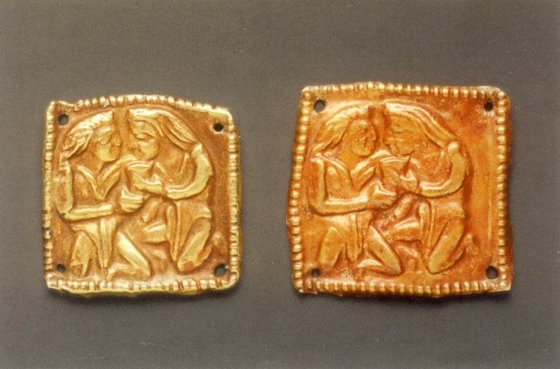 Две бляшки четырехугольные – скифы, пьющие из ритона