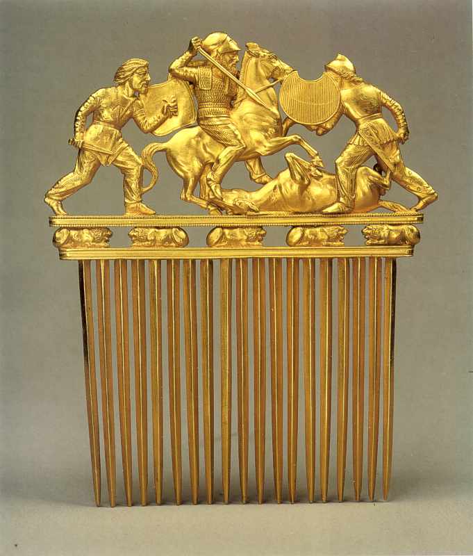 Уникальный золотой гребень был найден у правого плеча или возле черепа «царя». Гребень имеет девятнадцать зубцов, которые венчает скульптурная группа из трех сражающихся воинов. Батальная композиция покоится на фризе из пяти фигур лежащих львов. Гребень был изготовлен из отдельных, отлитых по восковой модели, деталей, некоторые из которых были затем прокованы и спаяны между собой (определение Р.С. Минасяна). За более чем 80-летнюю историю изучения солохского гребня было предложено несколько версий, истолковывающих смысл его изображения: от почти фантастической до рассматривающей его в рамках реконструированного Д.С. Раевским скифского мифа об убийстве первого скифского царя Колаксая его братьями Липоксаем и Арпоксаем. Обычно же исследователи ограничиваются лишь общим описанием батальной сцены, отмечая ее реалистический, этнографический или эпический характер.