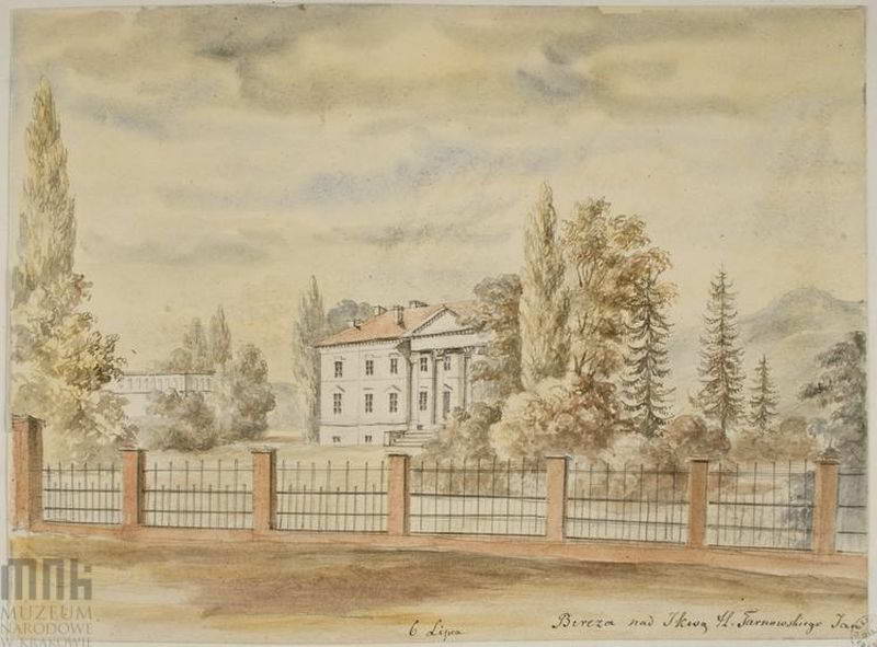 Pałac Tarnowskich. Widok od strony podjazdu. Pałac dwukondygnacjowy z portykiem kolumnowym w wielkim porządku. 1862—1876. Dat.: 6 Lipca. Napis: Bereza [!] nad Ikwą H. Tarnowskiego Jan[a]; napis na podkładzie: Wołyń Bereza nad Ikwą. Rys. ołówkiem podmalowany akwarelą, 20,5x27,8. Ill-r.a. 4142 (Teka Wołyń). [Katalog rysunków architektonicznych ze zbiorów Muzeum narodowego w Krakowie. 1. Rysunki Napoleona Ordy / Opracowały Zofia Kucielska i Zofia Tobiaszowa. – Warszawa: Państwowe wydawnictwo naukowe, 1975, Nr. 39]