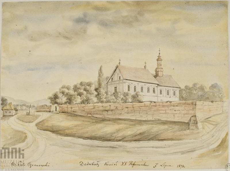 Костел св. хреста (колишній костел реформатів). Вид фасаду та бічної стіни однонавового костелу з відокремленим пресбітерієм та сигнатуркою. 1874 р. Дата 7 липня 1874 р. Напис: Гр. Петро Чосновський.Давній костел реформатів. Напс на підкладці: Волинь Дедеркали. Тут Колонтай народився. Рисунок олівцем, підмальований аквареллю. 20.5:27.8. III-r.a. 4156 Папка Волинь. [Katalog rysunków architektonicznych ze zbiorów Muzeum narodowego w Krakowie. 1. Rysunki Napoleona Ordy / Opracowały Zofia Kucielska i Zofia Tobiaszowa. – Warszawa: Państwowe wydawnictwo naukowe, 1975, Nr. 140]