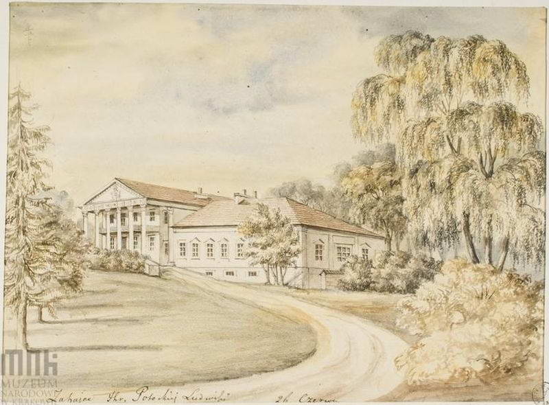 Pałac Potockich dawniej Bobrów. Widok od strony podjazdu. Pałac parterowy, wysoko podpiwniczony, z portykiem kolumnowym w wielkim porządku i balkonem w dwukondygnacjowej części środkowej. 1862 – 1876. Dat.: 26 Czerwca. Napis: Zahajce Hr Potockiej Ludwiki; napis na podkładzie : G. Wołyńska Zahajce, – pałac. Rys. ołówkiem podmalowany akwarelą, 20,5 x 27,7. III-r.a. 4292 (Teka Wołyń). [Katalog rysunków architektonicznych ze zbiorów Muzeum narodowego w Krakowie. 1. Rysunki Napoleona Ordy / Opracowały Zofia Kucielska i Zofia Tobiaszowa. – Warszawa: Państwowe wydawnictwo naukowe, 1975, Nr. 856]