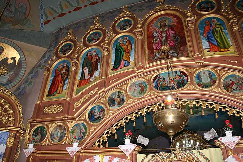 Ліва частина іконостасу Розмір зображення: 800:533 піксел Фото Зенона Боровця і Богдана Тхора, 11 травня 2017 р. Вкладені елементи Пророки 1 – 2. Апостоли 1 – 2 Пророки 3 – 4. Апостоли 3 – 4 Пророки 5 – 6. Апостоли 5 – 6 Апостоли 7 – 8 Ікони «Різдво Марії», «Введення», «Благовіщення» Ікона «Таємна вечеря» Ікони «Преображення», «В’їзд до Єрусалиму»