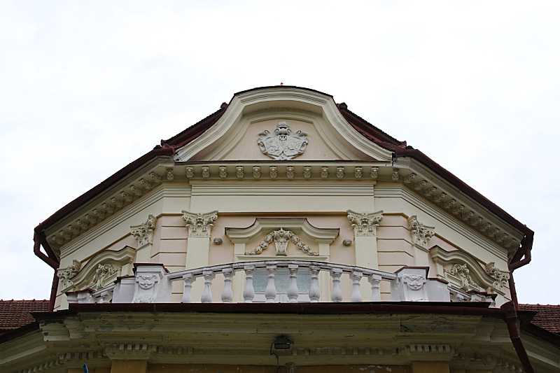 Фронтон головного фасаду Розмір зображення: 800:533 піксел Фото Зенона Боровця і Богдана Тхора, 25 липня 2017 р. Вкладені елементи Герб на фронтоні головного фасаду