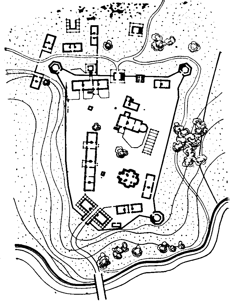 Крупицко-Батуринский монастырь, XVII-XVIII вв. План, составленный по рисунку в поминальной книге монастыря (серед. XVIII в.), по обмерам и исследованиям автора (стр. 73)